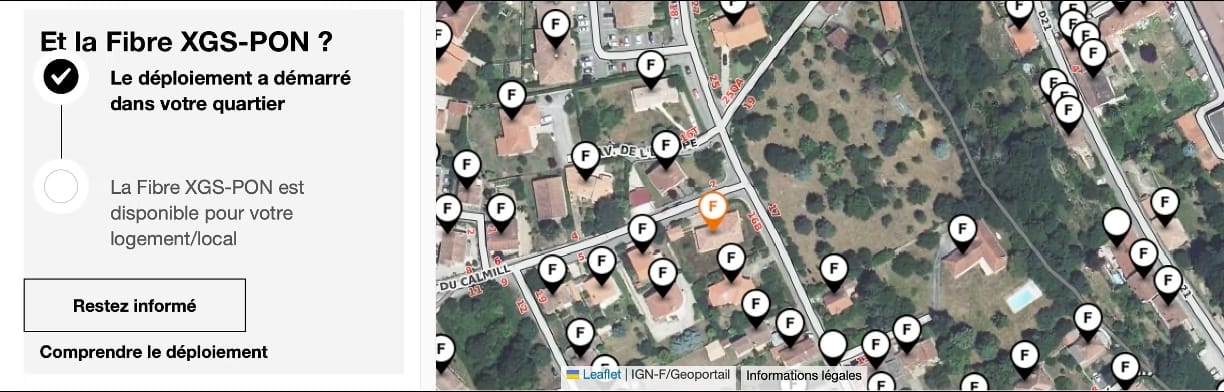 La première, et elle est assez récente comme l'a remarqué l'utilisateur @Crikri71 sur X : Orange affiche désormais pour chaque adresse testée un nouvel encart indiquant "Et la Fibre XGS-PON ?" sans aucune indication. Sans être sorcier, cela signifie probablement que le déploiement XGS-PON est bien prévu dans votre quartier mais pas de travaux encore commencé, mais que Orange veut vous rassurer que ça va venir. Délai qu'on a généralement constaté de la part des utilisateurs jusqu'à l'étape suivante : 6 mois. Si comme @Crikri71 vous êtes du genre très impatient (et nous le comprenons parfaitement), vous pouvez toujours remplir le formulaire de Prise d'intérêt en cliquant sur le bouton "Restez informé" et en renseignant vos coordonnées.