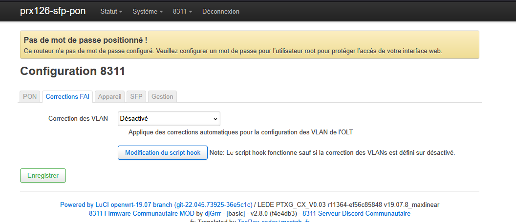 https://192.168.11.1/cgi-bin/luci/admin/8311/config. - Connectez-vous avec votre mot de passe root.