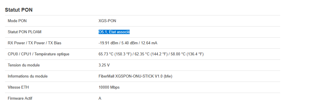 Après que la configuration du WAS-110 est terminée, vous devez obtenir le statut O5.1 cela signifie que vous êtes désormais authentifié avec succès sur l'OLT d'Orange.