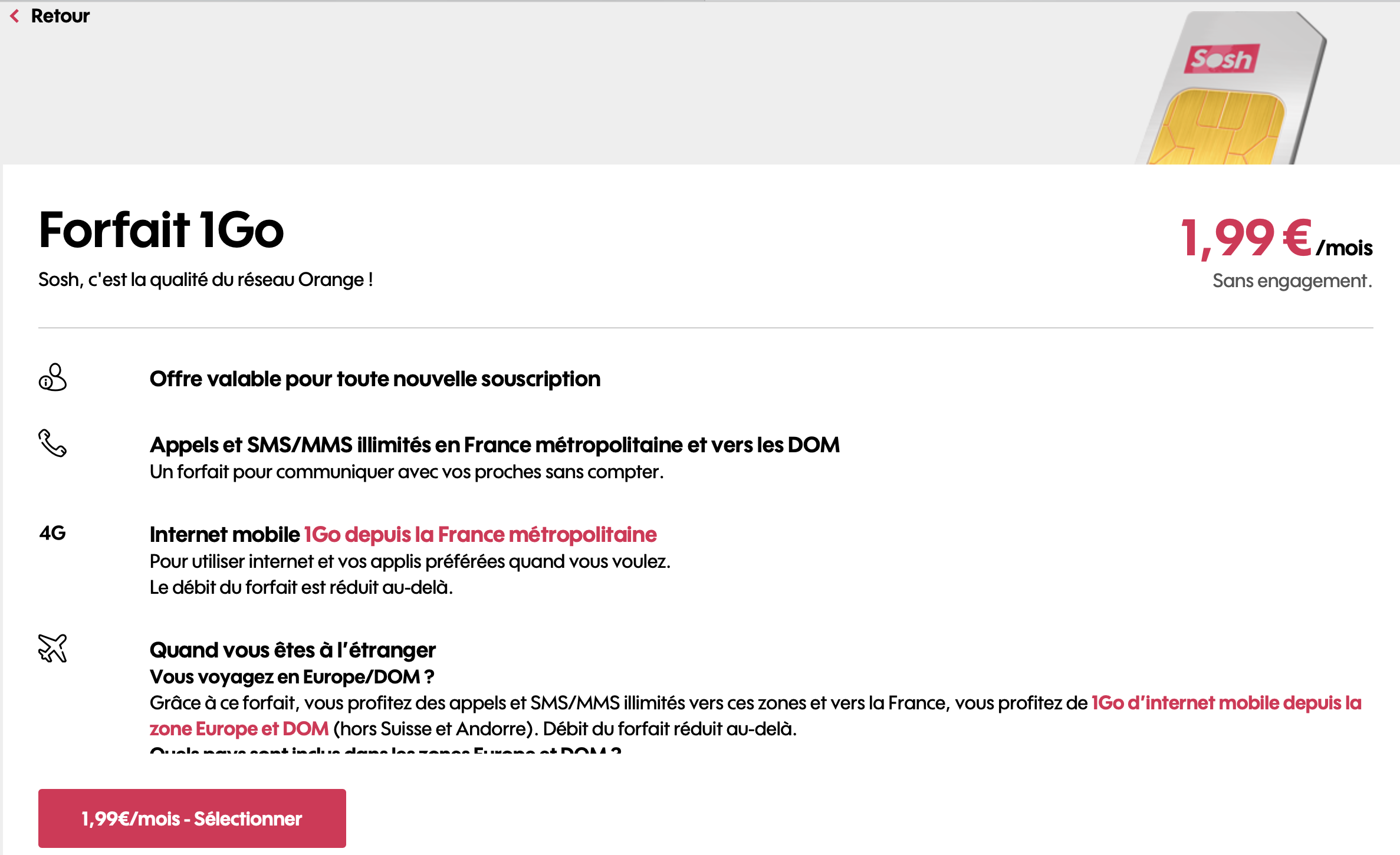 Et pour compléter ton abonnement Internet sans exploser ton budget, Sosh propose aussi un forfait mobile à seulement 1,99 €/mois. Oui, tu as bien lu !