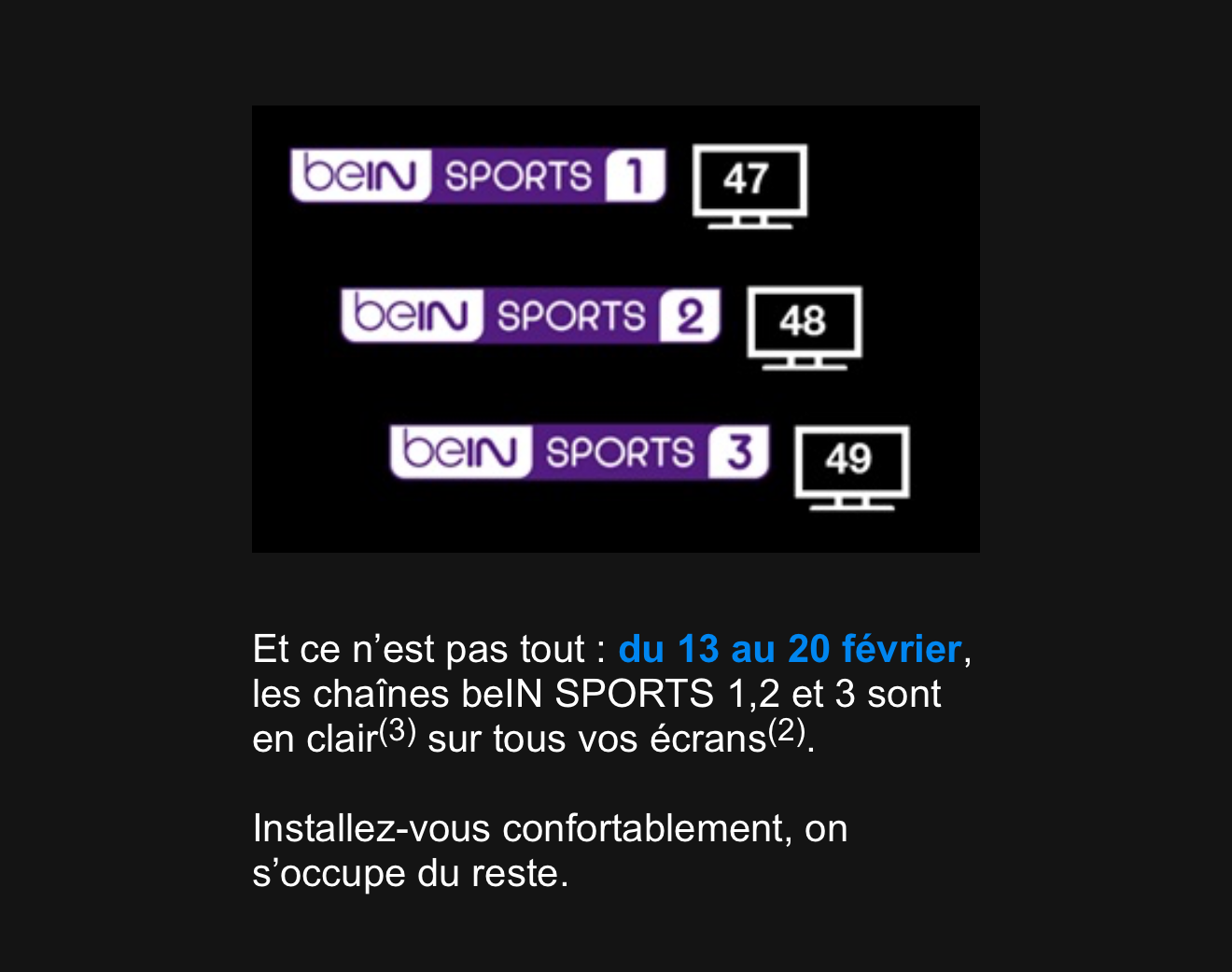 Dans un mail envoyé ce jour aux abonnés, Orange informe que les 3 chaînes Bein Sport 1, 2, 3 seront en clair du 13 au 20 février prochains sur tous les écrans (décodeur, TV connectées, PC, MAC et applis Orange TV pour Android et Apple TV)