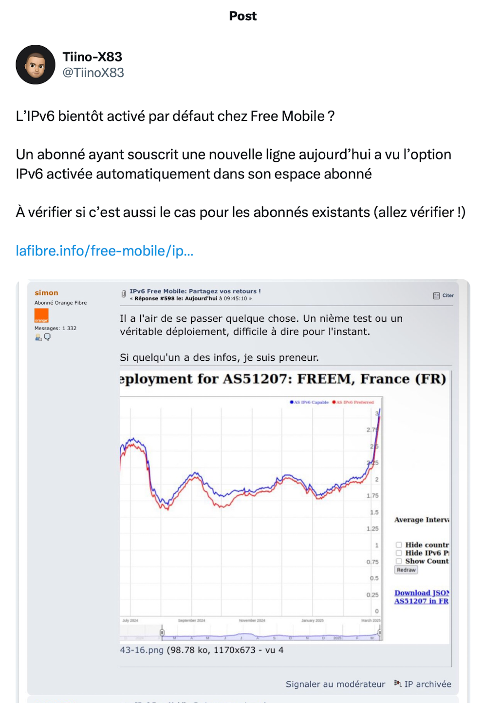 Néanmoins, à en croire le compte X @Tiino-X83, l’IPv6 serait désormais activé par défaut pour tous les abonnés Free Mobile, depuis le 17 mars 2025.