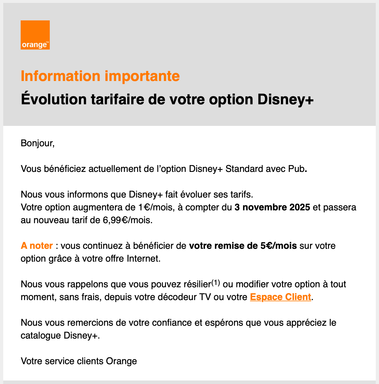 Ces derniers jours, plusieurs clients Orange ont reçu un mail au ton très officiel : “Information importante – Évolution tarifaire de votre option Disney+”