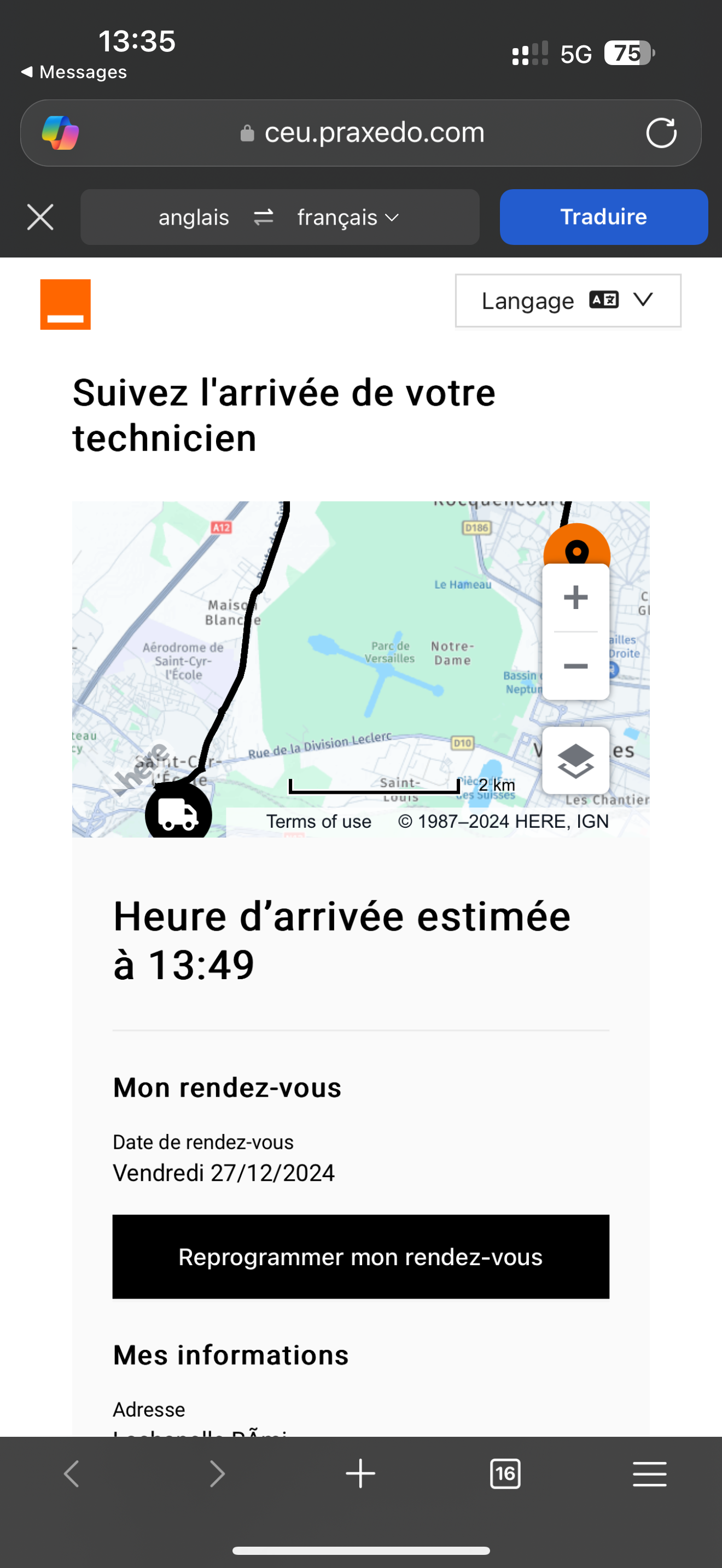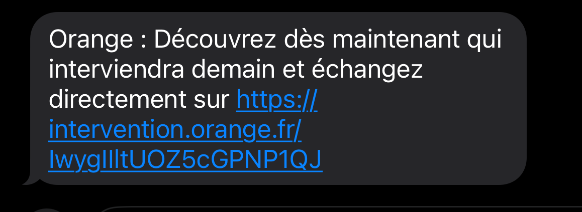 Deuxième surprise : la veille du rendez vous, je reçois un autre SMS, de la part d'Orange cette fois. Il permet de consulter la fiche du technicien qui va intervenir, et même d'échanger avec lui par un système de messagerie intégré. Pour des raisons de confidentialité évidente et comme je ne lui en ai pas parlé, je ne l'afficherai pas ici. Toujours est il que c'est très rassurant pour la suite.