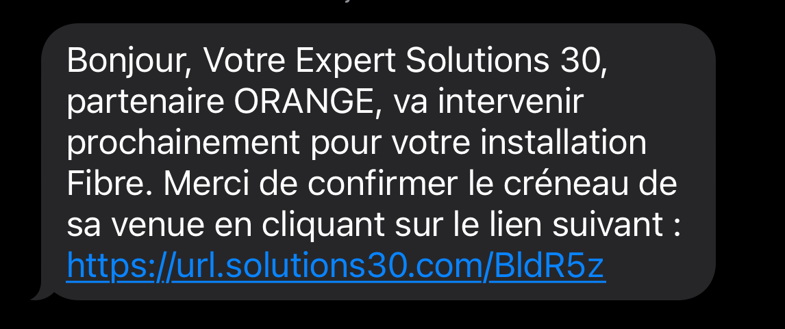 Première surprise : quelques jours avant le rendez vous, je reçois un SMS me permettant de connaître l'entreprise (sous traitant) pour lequel travaille le technicien en charge du raccordement. Ce SMS permet par ailleurs de confirmer ou de modifier le rendez vous en cas d'empêchement de dernière minute.